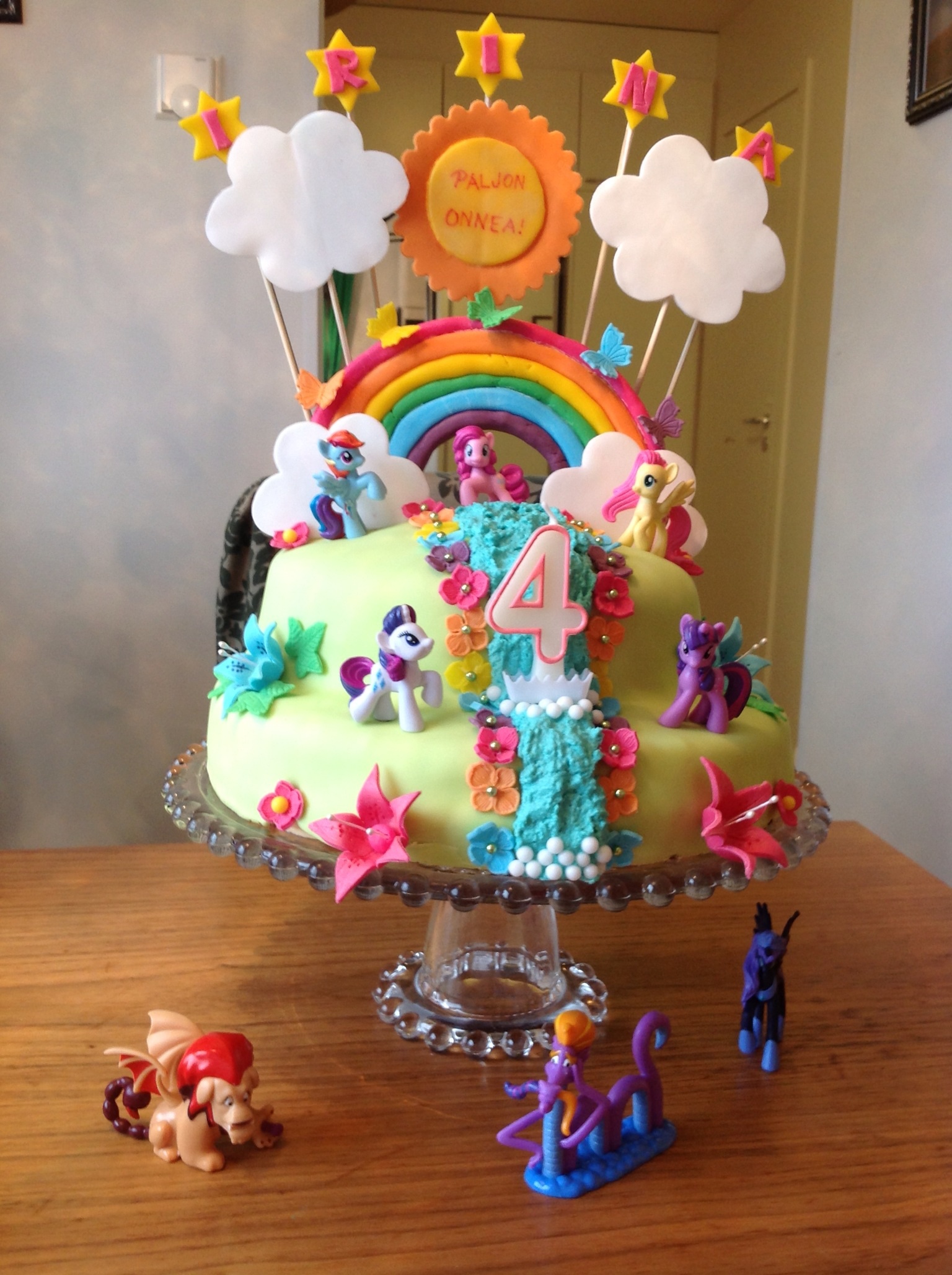 Päädyin toteuttamaan päähenkilöt kolmiulotteisina hahmoina, vaikka en olekaan sen suhteen omalla vahvuusalueellani. Useampi hahmo on kuitenkin helpompi toteuttaa tällä tavalla, sen sijaan yhden yksittäisen hahmon olisin varmaankin tehnyt maalaamalla. Esimerkkejä maalatuista kakuista löytyy Lapset-kategoriasta.