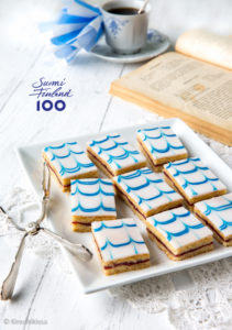 Perinteisen aleksanterinleivoksen kuorrute on värjätty vaaleanpunaiseksi, mutta tein sen juhlavuoden kunniaksi Suomen lipun väreissä. Leivoksesta saakin kuorrutteen väriä vaihtamalla erilaisiin juhlasesonkeihin sopivia versioita. Raidoituksen sijaan myös nonparellit ja koristerakeet sopivat viimeistelyyn. Raidat voi pursottaa myös suklaasulalla.