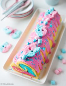 Halusin kehittää reseptin, jossa Bubsien aito maku maistuu jokaisessa suupalassa. Siksi täyte on tehty itse makeisista, ja kääretortun sisällä toistuu sama kahtiajako kuin karkeissakin: toisella puolella vaaleanpunainen, toisella turkoosi. 🩵🩷 Voit toki soveltaa reseptiä myös muihin väreihin, kunhan käytät rakenteeltaan tämän reseptin makeisia vastaavia vaihtoehtoja.