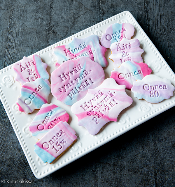 Pienillä leimasinmuoteilla koristelu on hauskaa näpertämistä. Teksti rakennetaan kirjain kirjaimelta juuri siihen hetkeen sopivaksi. Näyttävän pikkuleipätarjottimen saa, kun yhdistää eri muotoja ja tekstejä. Esimerkkiasetelmassa on muutama isompi pikkuleipä, johon mahtuu juhlan aihe tai toivotus. Ympärillä voi olla esimerkiksi ikänumerolla tai päivänsankarin nimellä varustettuja pikkuleipiä.