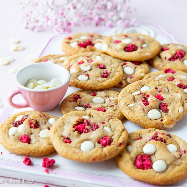 Valkosuklaan ja vadelmien yhdistelmä hellii makuaistia tässä amerikkalaisten suklaahippukeksien marjaisassa muunnelmassa. Jos olet cookie-fani, tämä vadelmainen uutuus kannattaa ottaa leivonta-agendalle. Helppoja tehdä, niin herkullisia ja rakenteeltaan pehmeän sitkeitä. 💗 Reseptissä käytetään pakastekuivattuja vadelmia, jotka eivät vetistä taikinaa, mutta pehmenevät uunissa marjaisiksi sattumiksi.