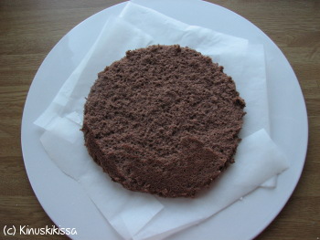 Mikäli kokoat kakun suoraan tarjoilulautaselle, laita jo ennen kokoamista alimmaisen pohjan alle leivinpaperisuikaleita. Työnnä suikaleita n. ½ cm pohjan alle. Näin täyttämisen ja koristelun voi tehdä huolettomammin, kun tarjoilulautanen ei sotkeennu. Mikäli olet hyydyttänyt kakun irtopohjavuokaan (tai vastaavaan) ja siirrät kakun vasta valmiina kakkulautaselle, tuikkaa leivinpaperit paikoilleen tässä vaiheessa.