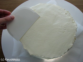 Sivujen tasoittaminen nostaa osan kermasta möykyiksi päällisosan reunoille. Tasoita nämä vetämällä raappaa kakun pinnalla reunoilta keskiosaan päin.