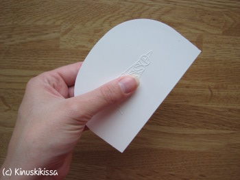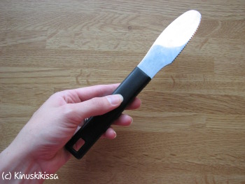 Levitä kermaa ensin paksuhko (n. ½ cm) kerros joka puolelle. Käytän itse levittämisessä (myös monessa muussa leipomisessa aina, kun jotain täytyy levittää) apuna tällaista leveää ja ohutta veistä. Veitsessä on vain hieman sahalaitaa. Se lienee Fiskarsin ja taitaa kulkea nimellä voiveitsi (?).
