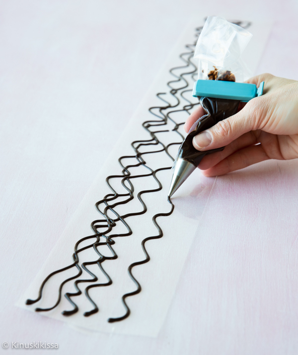 Sulata suklaa mikrossa miedolla lämmöllä. Laita suklaasula pieneen pakastuspussiin ja leikkaa kulmaan pieni aukko. Tasaisin jälki syntyy pursotuspussia ja tyllaa käyttämällä. Tässä käytössä oli pieni, 1 mm:n kokoinen kirjoitustylla.