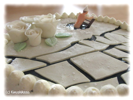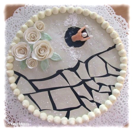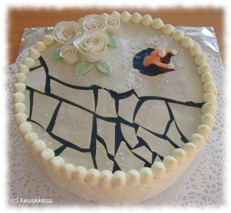 Nostin valmiin kakun jääkaappiin noutoa odottamaan. Jotenkin minulla oli kuitenkin epämääräinen olo, että onko kaikki nyt kohdallaan. Kurkistelin vähän väliä jääkaappiin tarkistaakseni, että kakku on yhä tallessa. 😉 Sitten huomasin ukkelin olevan vähän kallellaan. Tarkempi tarkastelu osoitti, että marsipaani oli alkanut sulaa kiilteen päällä. Se oli siis ehdottoman huono alusta marsipaanille! Jos kakku olisi syöty parin tunnin sisällä, mitään ongelmaa ei olisi ollut. Mutta nyt iltaan oli vielä aikaa. Otin sitten portaat ja uimarin pois, jotta enempää vahinkoa ei syntyisi. Kovia kokeneelta avantouimarilta jouduin amputoimaan jalan. Laitoin koristeet paikoilleen vasta, kun kakkua tultiin hakemaan. Päädyin käyttämään uimarin tukena cocktail-tikkua (tikku kulki miekkosen sisällä ja siitä suoraan kakkuun). Sen avulla sain uimarin mielestäni hyvin tukevasti kakkuun kiinni. Portaat saivat nojata jään reunaan, joten niidenkään pehmeneminen ei onneksi pilannut alkuperäistä suunnitelmaa. Myöhemmin luin huojentuneena tekstiviestin, jossa kakkua kiiteltiin kovin. Loppu hyvin, kaikki hyvin!
