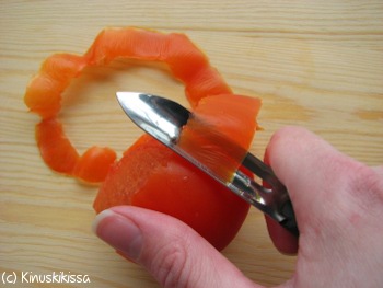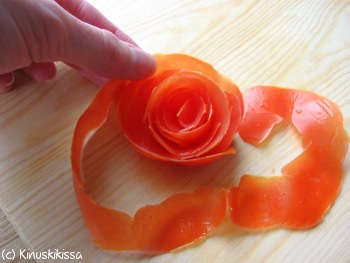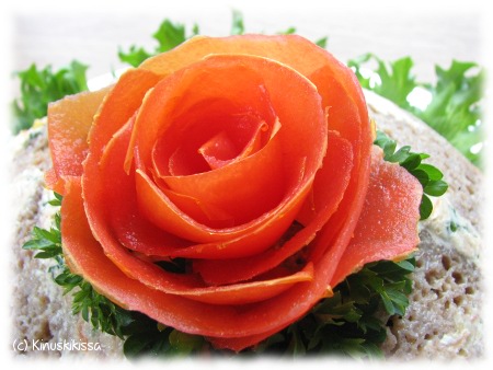 Valitse tomaattiruusua varten kovia tomaatteja, jotka ovat helpompia kuoria. Kuori tomaateista pitkiä suikaleita. Kierrä suikaleen pää rullalle ja ala sitten kietoa ympärille löyhästi ”kuorinauhaa”. Laita ruusun tueksi esimerkiksi persiljaa, jotta se pysyy kauniisti koossa.