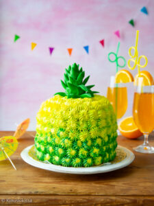 Muhkea ananaskakku tuo tropiikin tullessaan! Kakussa maistuvat monet hedelmäiset maut. Ananas-mantelikakkupohjan päällä on survottua banaania ja mango-passiorahkasta tehty täyte. 🍍🥭🍌 Ananas komistaa teemajuhlia mutta sopii myös kevätkakuksi.