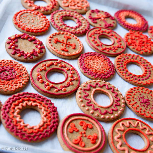 Appelsiinin väri innosti myös koristelussa, johon valitsin oranssin ja punaisen. Kokonaisuudesta tulee näyttävä, kun tekee erilaisia kuvioita, vaikka käyttäisikin kaikkiin pipareihin samoja sävyjä. Jos kuorruttamisessa käytettyyn pikeeriin haluaa appelsiinin makua mukaan, voisi siinä hyödyntää aromia.