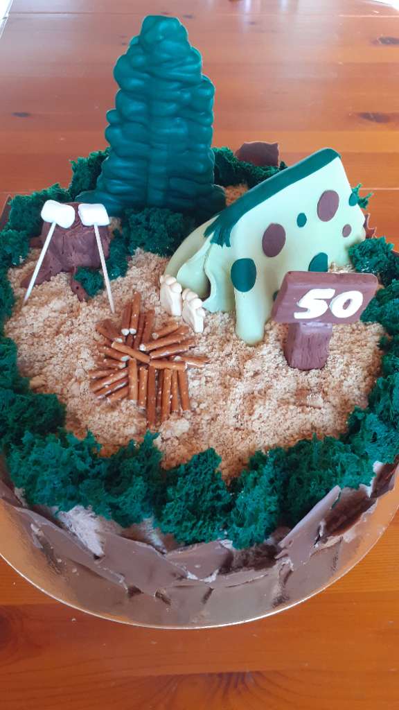 Metsästystä ja retkeilyä harrastavalle sankarille tilattiin retki aiheinen kakku. Suklaakaarnoihin ja pikeerikuusiin nappasin idean tästä Kinuskikissan itsenäisyyskakusta. Diggestive muru hiekkana vaniljamassaa muut koristeet. Syötävän sammaleen teko oli helppoa ja nopeaa.