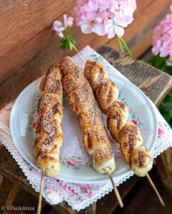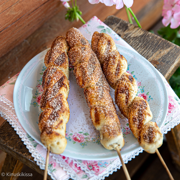 Kesällä ruoan valmistus on ihanaa hoitaa ulkosalla jälkiruokaa myöten. Makeiden herkkujen grillaamisessa on huomioitava, että grilli kypsentää alapuolelta, eikä pinta saa paistoväriä. Kehittelin tämän pullaohjeen käyttämällä inspiraationa nuotiolla paistettavaa tikkupullaa. Grillipulla on tikkupullaa näppärämpi kypsentää, sillä kaasugrillillä lämpötilaa on helppo säätää ja ritilän päällä pulla kypsyy joka puolelta tasaisesti. Grillipullia ei täytetä, vaan ne viimeistellään korvapuustin makuisiksi voisulalla ja kanelisokerilla.