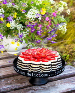 Juhannuksena meidän kahvipöydässä oli tarjolla tämä kukkea Oreo-kakku. Valitettavasti kakun muoto ei tästä kuvakulmasta tule kunnolla esiin, mutta kakku muistutti tosiaan jättimäistä kukkaa. Tätä voi mainostaa mökkikakkuna, sillä uunia ei tarvita ja aineslistakin jää lyhyeksi. Kakku täytyy tehdä jääkaappiin edellisenä päivänä, mikä helpottaa valmisteluita. Pursotuspussia suosittelen, koska täyttäminen on sen kanssa huomattavasti helpompaa.
