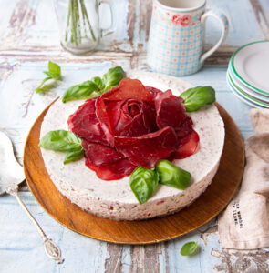 Voiko voileipäkakku olla raikas? Kyllä, tätä uusinta reseptiä luonnehtisin tällä adjektiivilla. Kasviksia on täytteessä runsaasti, kylmäsavuporo antaa maun. Senpä takia tämä onkin ”useamman palan kakku”. Innostuin koristelemaan kakun jättiruusulla, jonka tyttäreni tekivät minulle äitienpäivänä aamupalapöytään. Ruusu oli kuulemma Tiktokista bongattu. Ruusun voi tehdä mistä tahansa leikkeleestä, mutta kaikkein parhaiten se onnistuu, kun leikkele on koostumukseltaan ohut ja taipuisa. Katso video Kinuskikissan Instasta! 🎥