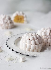 Isoista valkoisista vaahtokarkeista voi loihtia kakulle iglu-lookin, mutta saman ajatuksen voi toteuttaa myös pikkuruisista vaahtiksista minikokoisille muffinsseille. Valkoisia mini-vaahtokarkkeja myydään esimerkiksi Citymarketeissa (merkki Little Becky) ja löytyy niitä Haribon sekoituksestakin. Näitä kakkusia suosittelen sellaiseen hetkeen, jolloin tavoitteena ei pelkkä herkuttelu vaan yhdessä puuhastelu. Minä tein näitä omien tyttärien ja 15-vuotiaan leivonta-apulaiseni kanssa (kiitos Miljalle!) ja neljän hengen tiimiltämme koristelun parissa vierähti tunnin verran. 😊