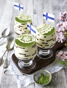 Suven juhlintaan ja leivonnaisten koristeluun haen inspiraatiota lähiluonnosta. Koivu kuului olennaisesti lapsuuteni juhannuksiin, siksi se pääsi myös näiden jälkiruokamaljojen aiheeksi. Vaarin opastuksella opin tekemään juhannusvihdan ja ovenpielet koristeltiin koivuilla. Koivun kaarnaa muistuttava kuvio näkyy lasien reunoissa ja lehdenvihreä pitsikuviossa. Voit valmistaa maljat jääkaappiin jo tarjoilua edeltävänä päivänä.