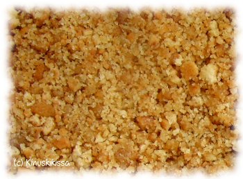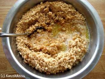 Sulata voi kattilassa. Sekoita keksimurut ja voi kulhossa (tai säästääksesi tiskiä -> tyhjennä keksimurut pussista suoraan kattilaan ja hoida sekoittaminen siinä). Älä heitä pussia roskiin vaan säästä se seuraavaa kertaa varten. Yleensä pussit kestävät useita käyttökertoja. (Täytekeksien tapauksessa täyte kuitenkin töhrii pussin sisustan niin, että silloin olen heittänyt pussin roskiin. Mutta ei tiskaaminenkaan iso vaiva olisi, jos ekologisia halutaan olla.)