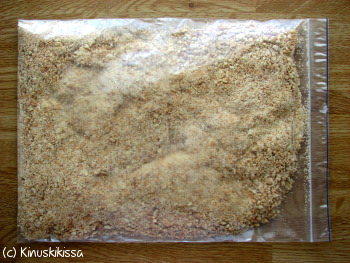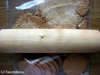 Käytin keksien murskaamisessa aiemmin pientä monitoimikonetta. Kapistuksen hajottua olen tehnyt murskaamisen alla kuvatulla tavalla. Näin on lopulta helpompaa, sillä tiskiä ei synny yhtään. Mutta toki teknisiä vempaimiakin voi hyödyntää.