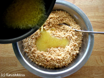 Monenlaisia mittasuhteita on tullut kokeiltua, mutta tällaisiin ohjeistuksiin olen päätynyt. Liian vähäinen rasvan käyttö johtaa murenevaiseen pohjaan ja liikaa käytettynä rasva taas kovettaa pohjaa liikaa. Myös sillä on merkitystä, mitä keksejä käyttää, kuinka hienoksi ne jauhaa ja miten keksipohjan painelee vuokaan.