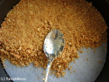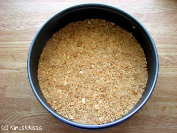 Perinteisin keksipohja lienee Digestive-kekseistä tehty. Myös kaurakeksejä tai vastaavia voi käyttää. Olen kuitenkin huomannut, että Digestivet murenevat todella helposti eli ne ovat helppoja, jos soveltaa murskaamisessa kaulin-menetelmää.
