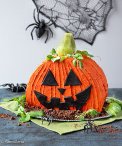 Täytteenä ja kuorrutteena toimii kreemi, joka takaa kakun koossa pysymisen myös kääntöoperaatiossa. Koska kreemi ottaa myös täytteen roolin, sen täytyy olla herkullista! Otin mukaan muscovadosokerin, joka antaa kreemille ihanan kinuskin maun. Tässä kreemi sai halloweeniin sopivan oranssin sävyn, mutta se on kaunis myös luonnollisen vaaleanruskeana, jollaisena se erottuu kauniisti tumman pohjasta.