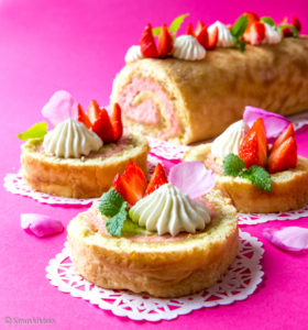 Makea mansikka ja raikas raparperi ovat ihanan kesäinen makupari. Tässä reseptissä kesän maut on kääritty rullalle ja tarjoiltu leivoksina. Annospaloiksi leikatusta kääretortusta saa näyttäviä leivoksia, kun koristelee ne kermapursotuksilla ja tuoreilla mansikoilla.