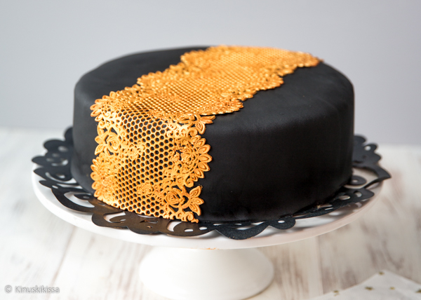 Pitsikoriste häikäisee kakun päällä – varsinkin hohtavan kultaisena! Tarvitset pitsikoristeen tekemiseen pitsiainepakkauksen, vettä ja silikonisen pitsimuotin sekä halutessasi pastaväriä ja kimallesuihketta viimeistelyyn.