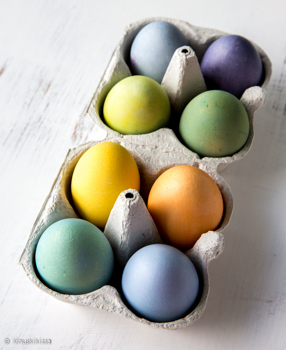 Kasvikunnasta löytyy runsaasti värjäämiseen soveltuvia aineita, joilla saa aikaan uskomattoman upeita, hehkuvia sävyjä. Minä valmistin pääsiäismunia varten värejä punakaalesta, kurkumasta, mustikasta ja keltasipulista. Värien kanssa touhuaminen oli mielenkiintoista ja palkitsevaa. Tuntui ihmeelliseltä, miten valkoinen kuori muuntui niin kauniiksi eri sävyiksi. Mukana oli yllätyksellisyyttä, sillä esimerkiksi punakaalineste oli sinipunaista, mutta kananmunan kuoreen väri jäi taivaansinisenä. Punajuuresta tuli kauniin pinkki neste, mutta munasta tuli ruskea. Punainen olikin ainoa sävy, jota en onnistunut valmistamaan, vaikka kokeilin myös puolukkaa ja paprikaa.