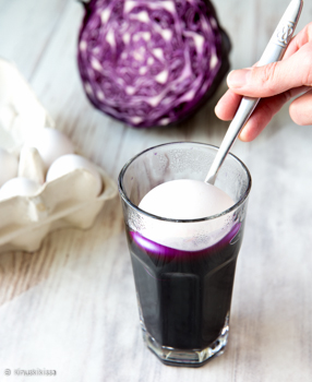 - Pyörittele värjäämisen alkuvaiheessa kananmunaa lusikan avulla lasissa noin puolisen minuuttia, jotta väri tarttuu tasaisesti. Tämän jälkeen kananmunan voi jättää lasiin värjäytymään. Huomaa, että värin teho vaihtelee suuresti. Esimerkiksi mustikka ei vaadi juuri muuta kuin kananmunan pikaisen kastamisen. Toisissa väreissä kananmunaa voi pitää pidempäänkin – esimerkiksi yön yli – riippuen halutun värin vahvuudesta.