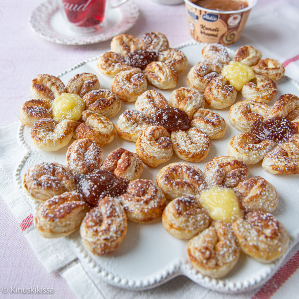 Ja entäs muoto sitten? Tähtitorttu toimii aina tai sitten voit kokeilla jotain torttumalliston ideaa. Jos mielit jotain täysin uutta, niin halkaise torttulevy pituussuunnassa ja jatka alta löytyvien vaihekuvien mukaisesti: lopputuloksena on kaunis kukka. 🌸