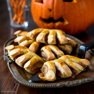 Karhuntassut – bear claws – tällainen leivonnainen oli taltioitunut verkkokalvolleni interwebsin ideakylläisestä maailmasta. Olin kirjannut sen lokakuun kohdalle, koska nämä tassut voisivat toimia halloween-kattauksessakin. Halutessaan näistä voisi tehdä myös sormimaisempia, kun jakaisi taikinan viiteen sakaraan ja leikkaisi ne pidemmiksi (nivelen kohtaan vähän viiltoja?). Tein täytteen itse, mutta valmis marmeladi ei ole yhtään hullumpi vaihtoehto.