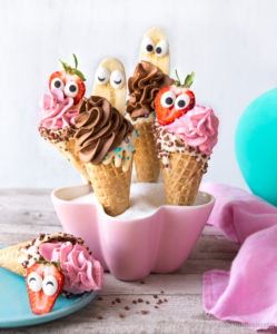 Nämä tötteröt eivät ole moksiskaan kuumasta kesäsäästä, sillä jäätelön sijaan ne on täytetty ihanalla pursotettavalla vaahdolla. Houkutteleva, pehmistä muistuttava ulkonäkö ja veikeät hahmot tuovat iloista meininkiä vaikka koulujen päättäjäiskekkereihin tai kesäisiin lastenjuhliin.