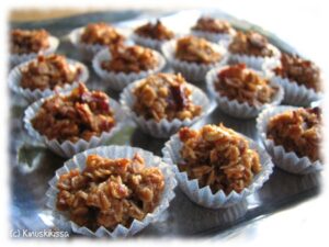 Myslipatukoiden ohjetta on useasti pyydetty. Tämän ohjeen voi tehdä myös patukkaversiona: seoksen voi levittää uunipellille ja leikata paistamisen jälkeen patukoiksi.
