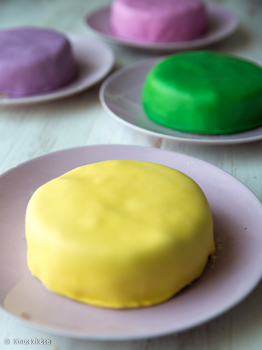 2,99€ | Hieman lötkömpää kuin Sallinen ja Renshaw | Alkoi sulaa noin vuorokaudessa, selkeä lammikko kakun ympärillä, falskasi testimassoista eniten | – Pakkaus on pahvia, eikä massan väri näy pakkauksen läpi -> hankaloittaa ensiostosta – Laaja ja hyvä värivalikoima (kirkas vihreä, sininen, pinkki ja keltainen), jonka saatavuus vaihtelee kaupasta riippuen – Pienemmissä 100 g:n pakkauksissa myös muita värejä |