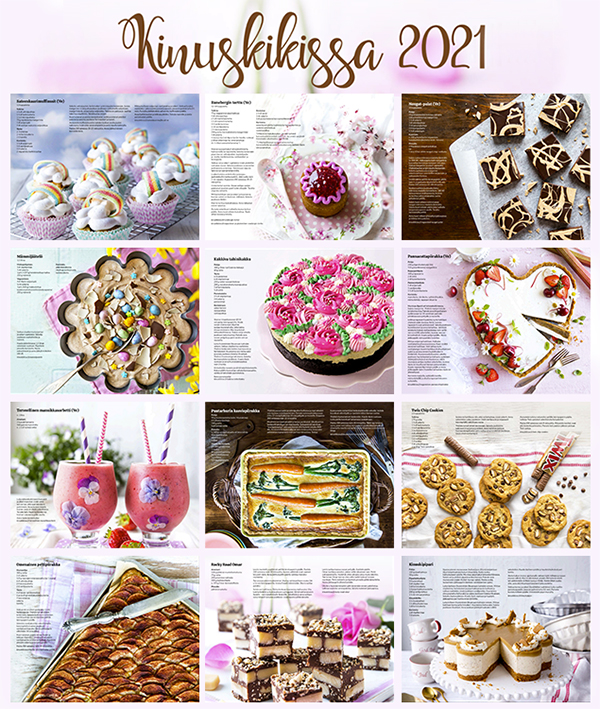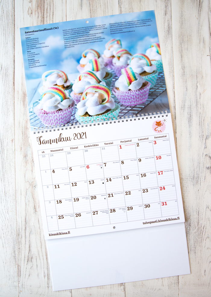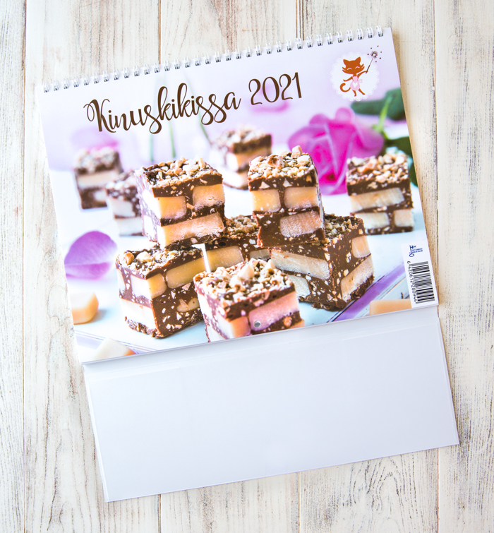Toivetuote on palannut! Kinuskikissan ystäville on tarjolla jälleen ensi vuonna leivontainspiraatiota seinäkalenterin muodossa. Parhaat blogikuvat on koottu seinäkalenteriksi, jossa jokaisen kuukauden kohdalla on sesonkiin sopiva resepti. Ensi vuoden kalenterin erikoisuutena on, että puolet resepteistä on vegaanisia. Kalenteria ei siis ole tarkoitettu vain seinän koristukseksi, vaan siitä saa innoitusta leivontahetkiin joka kuukausi. Kalenterin hinta on 16 € ja sitä myydään vain Kinuskikissan verkkokaupassa.