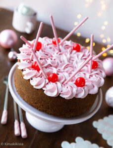 Mehevän suklainen kahvikakku ei petä myöskään jouluna! 🤎🍫 Kirsikkana kakun päällä toimii hempeän vaaleanpunainen kirsikkavaahto. 🍒 Myös taikinaa maustaa kirsikka, hedelmäkakusta tuttu joulun maku tämäkin. ❤️ Halutessasi voit leikata kakun kahteen osaan ja laittaa vaahtoa myös täytteeksi (tee silloin reilumpi annos).