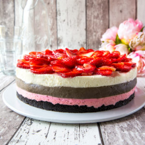 Tällaista kakkua meillä syötiin juhannuksen kahvipöydässä. Ajatus näiden kolmen maun yhdistelmästä oli jo pitkään siintänyt mielessäni. Vaikka mansikkaa ja lakritsia ei tyypillisesti liitetä yhteen, minusta makupari on toimiva. Mansikka on riittävän neutraali ja kuitenkin raikas lakritsin rinnalla. Tuoreet mansikat tekevät tästä kesäkakun!