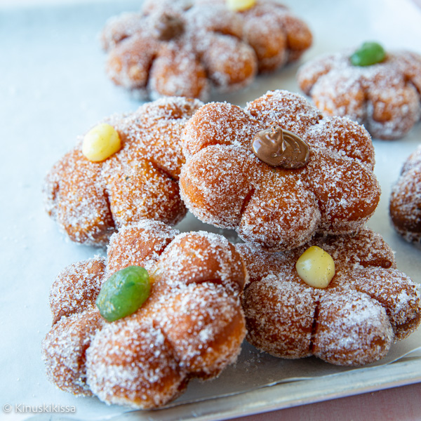 Kukkivat vappumunkit ovat syötävän söpöjä sokeriherkkuja, jotka kelpaavat fiinimpäänkin vappupöytään. 🌼 Muuntele makua erilaisilla täytteillä tai tee lajitelma useampaa sorttia. Välineeksi taikinan muotoiluun tarvitset tavallisen kukan mallisen piparkakkumuotin sekä sakset. Nips naps – tämä on hauskaa ja helppoa! Katso oheiselta videolta koko valmistus taikinasta paistamiseen ja täyttämiseen saakka.