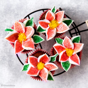 Tämä suklaamuffinssien luotto-ohje on palvellut lukemattomat kerrat, sillä se onnistuu hyvin myös laktoosittomana ja gluteenittomana. Koristelu on tällä kertaa jouluinen – palatkaamme vielä kerran vaahtokarkeista tehtyihin terälehtiin. 😊 Joulun alla ne saivat punaista pintaansa, jolloin syntyi joulutähtien asetelma.