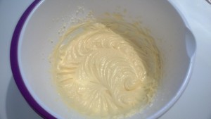 Vatkaa voi ja sokeri vaahdoksi. Lisää munat yksitellen. Jos et muistanut nostaa munia ajoissa huoneenlämpöön, laita ne hetkeksi lämpöiseen veteen ennen voisokerivaahtoon lisäämistä.