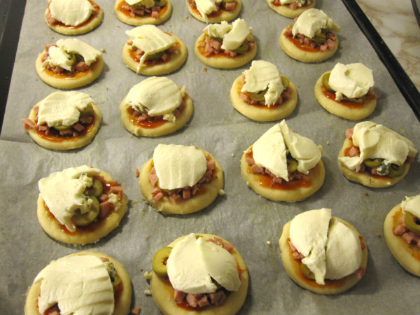 Sekoita kuivat aineet. Lisää huoneenlämpöinen voi ja smetana ja sekoita hyvin. Jos mahdollista, anna taikinan seistä noin 30 minuuttia kylmässä. Kauli taikina jauhotetulla pöydällä n. 0,5 cm paksuiseksi levyksi. Painele taikinasta pyöreällä lasilla (ø 6cm) kiekkoja. Voitele jokainen kiekko hieman ketsupilla, ripottele päälle oreganoa ja pitsasuikaleita. Viipaloi oliivit ja aseta viipaleet pitsojen päälle. Murenna sitten sinihomejuusto ja laita viimeiseksi jokaiseen pitsaan mozzarellaviipale.