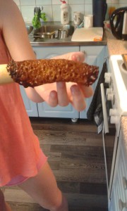 Laita uuniin ja tarkkaile niitä. Sokeri alkaa kiehumaan, ja se saa aikaan kauniin pitsimäisen pinnan. Brandy snapsit ovat valmiita pois uunista kun ne näyttävät tältä: