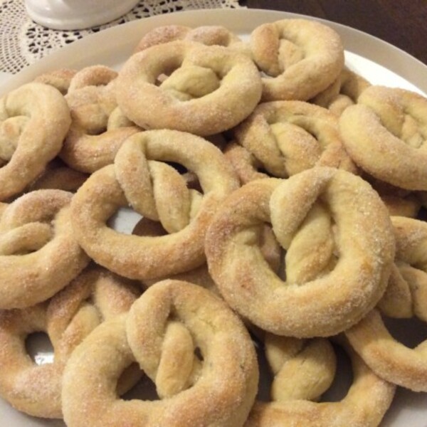 Jaa taikina noin 20:een palaan ja rullaa ne noin 30 cm pitkiksi ohuiksi tangoiksi. Kierrittele tangot ensin sokerissa ja sen jälkeen kiepauta rinkilöiksi.