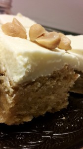 Vatkaa voi vaaleaksi vaahdoksi. Vatkaa joukkoon marshmallow fluff, jonka jälkeen tomusokeri ja vanilja aromi. Lisää lopuksi kerma ja vatkaa kunnolla. Levitä kuorrute jäähtyneiden blondiesien päälle. Leikkaa 16 palaksi tai 9 isommaksi. Koristele maapähkinöillä.