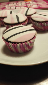 Päätin tehdä muffinsseja tyttömäisellä raita/seepra teemalla. Leivoin muffinssit Kinuskikissan muffinssiohjeella pienin muokkauksin, käytin vaniljajauhetta vaniljasokerin sijasta sekä kaakaojauheen korvasin n. 40g sulatettua tummaa suklaata. Lisäksi laitoin tummaan taikinaan mustaa pastaväriä.