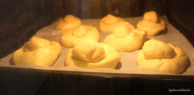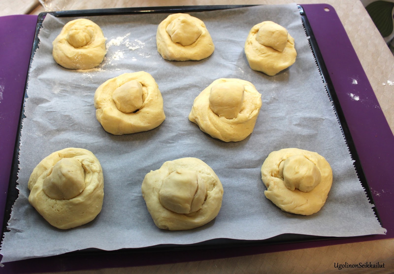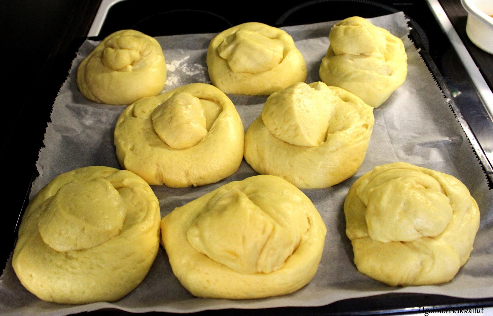 Aseta vain 4 pullaa pellille (koska kohoavat paljon) ja anna vielä kohoa uunissa jossa vain valo päällä 1,30 min.
