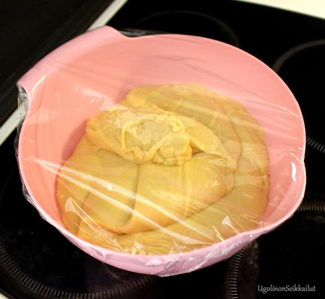 Siirrä taikina kulhoon ja peitä kelmulla. Anna kohoa 3 tuntia.