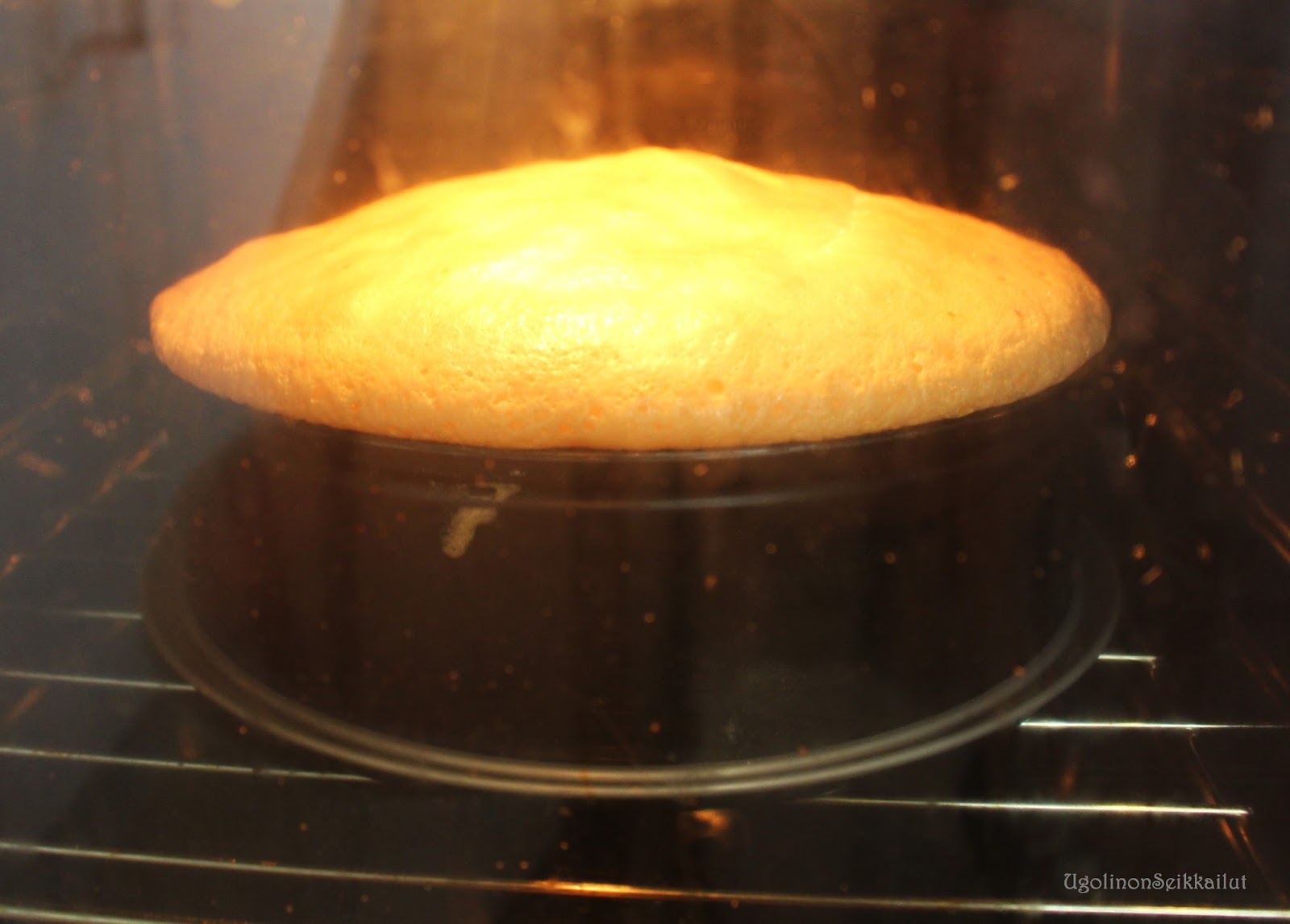Älä avaa uunia liian aikasin ja nopeasti sillä pehmeä kakkupohja lässähtää samantien.