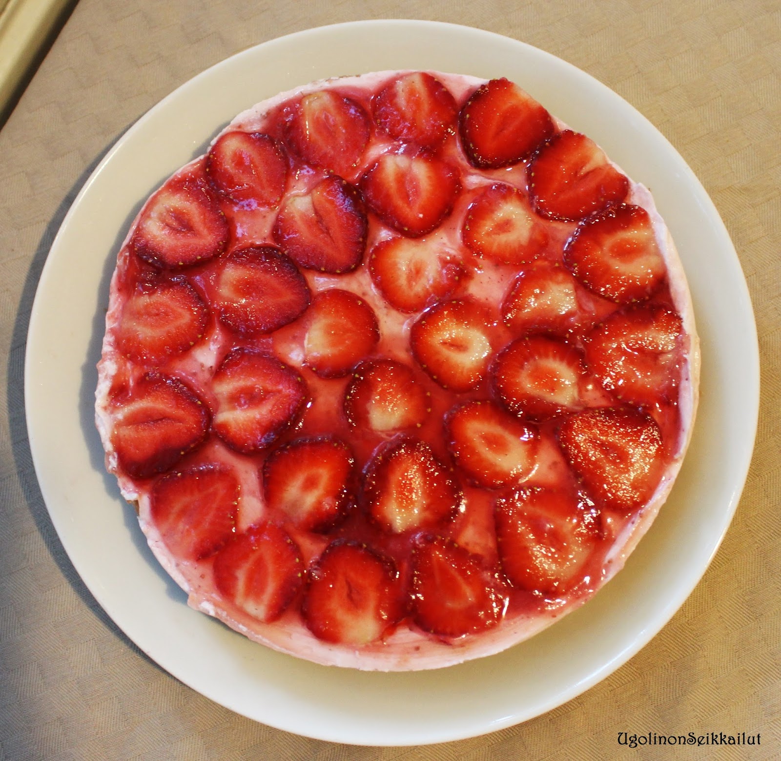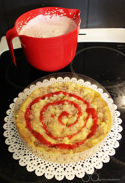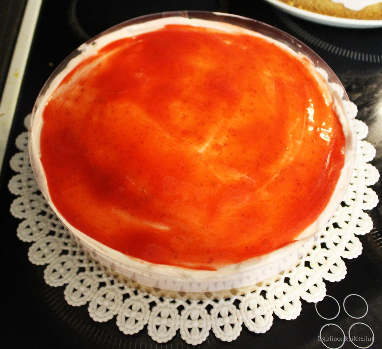 Kostuta kakkupohjalla sekoittamalla mansikkamelba ja mansikkamehu keskenään.