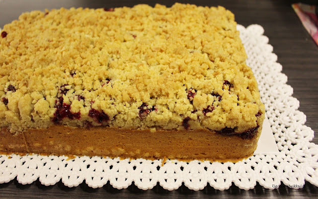 Valmista ekana crumble taikina. Sekoita jauhot, sokeri ja nypitty voi keskenään. Työskentele käsillä kunnon sileä taikina. Jos taikina on liian kuiva lisää tilkka maitoa sekaan.