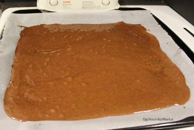 Kaada seos 40×30 uunivuokaan joka on peitetty leivinpaperilla.